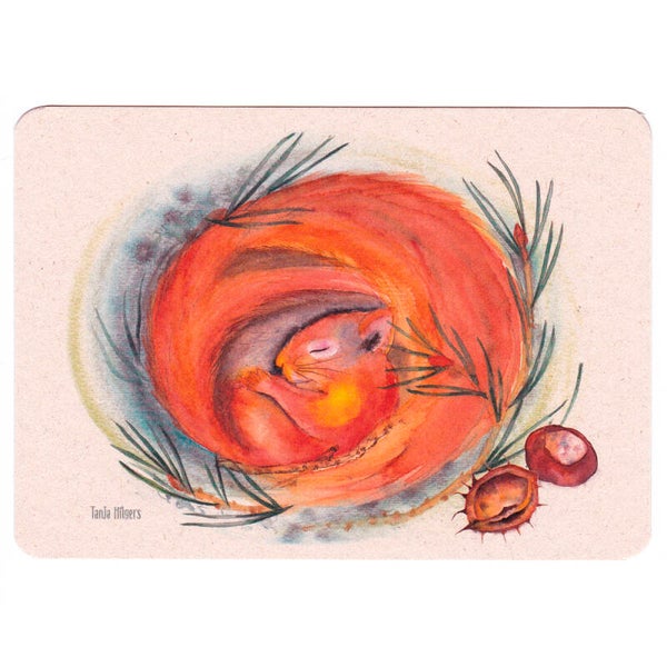 Mooi geillustreerde kaart van Eekhoorn in een bed van korstmos en den.
