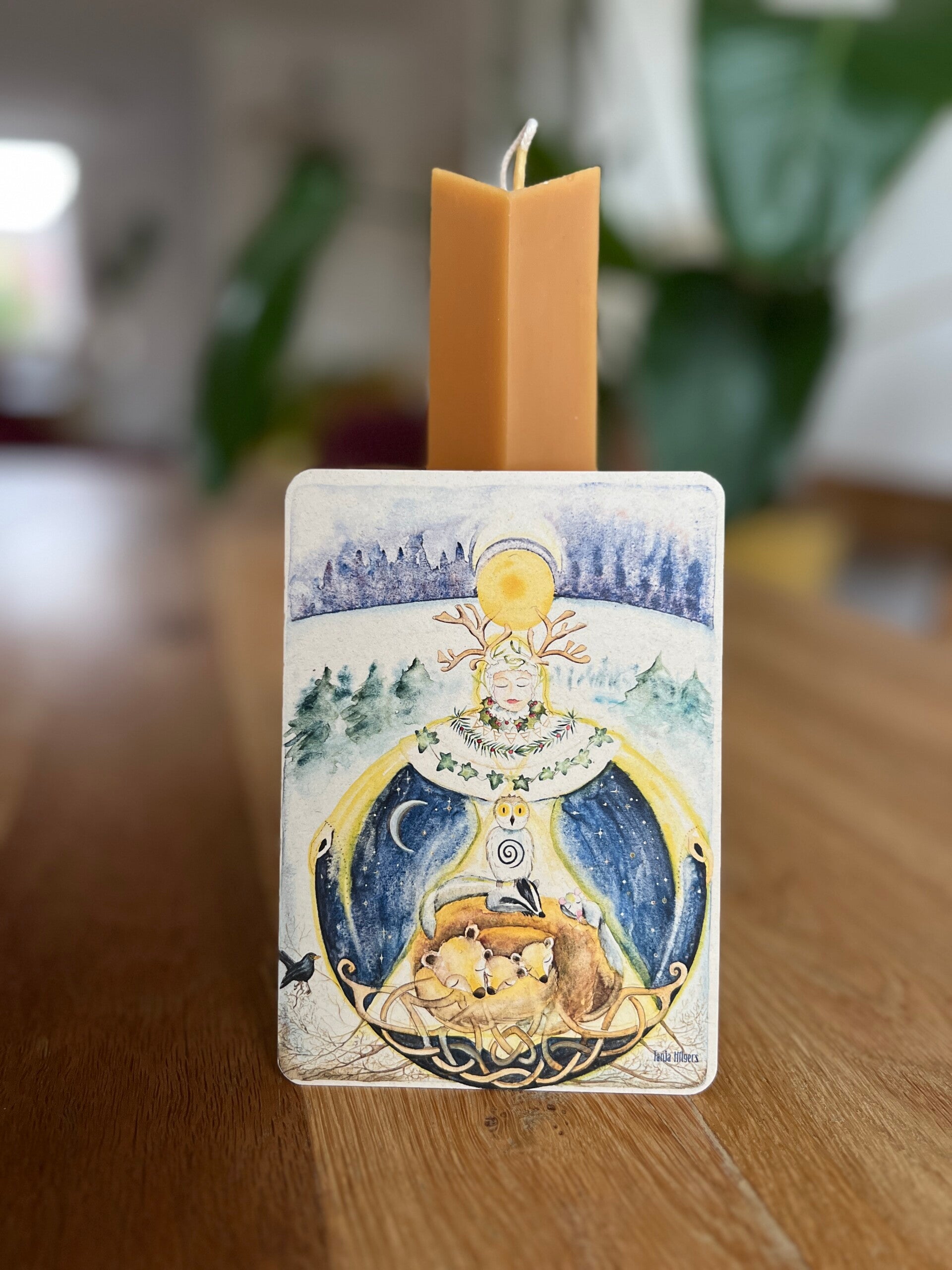 In de langste en donkerste nacht van het jaar baart de aardmoeder de nieuwe zon en de nieuwe maan. Zij waakt over de slapende dieren en zaden. Haar mantel is gesmukt met de midwinterplanten klimop, hulst en maretak.