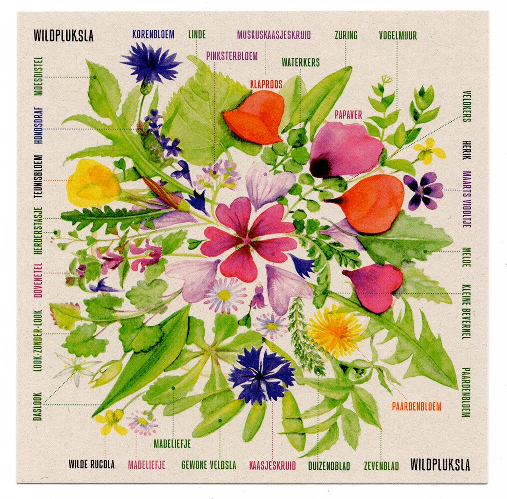 Bloem: Korenbloem, Klaproos, Mosterd, Viooltje, Kaasjeskruid, Paardenbloem Dovenetel, Teunisbloem, Hondsdraf, Pinksterbloem, Malva, Madeliefje, Smeerwortel.