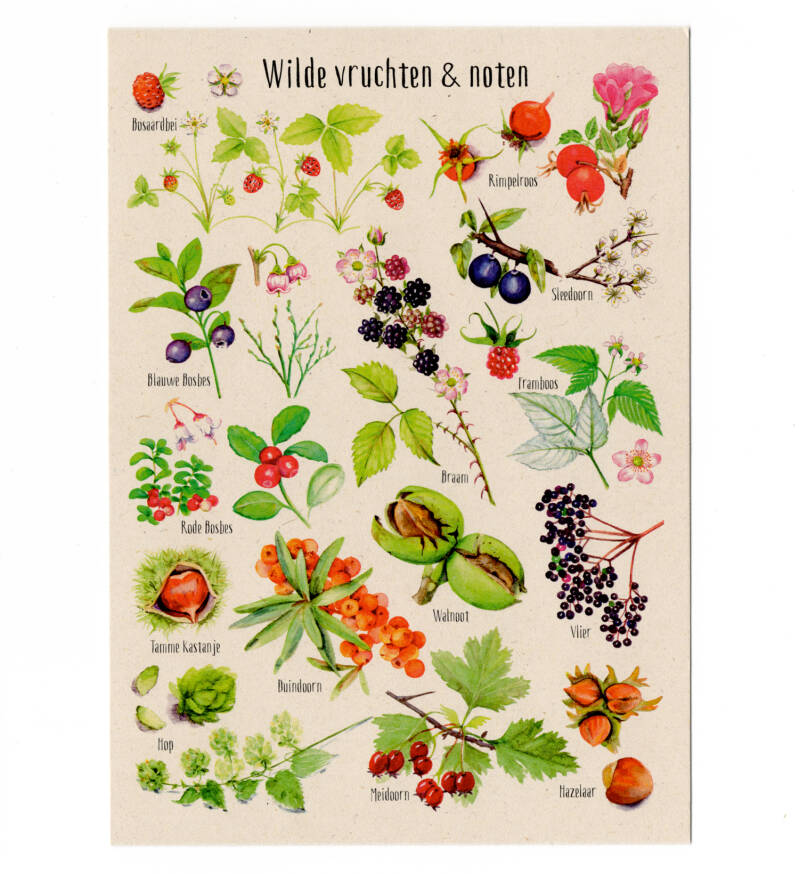 Postkaart met botanische wildpluk illustratie van wilde vruchten en noten