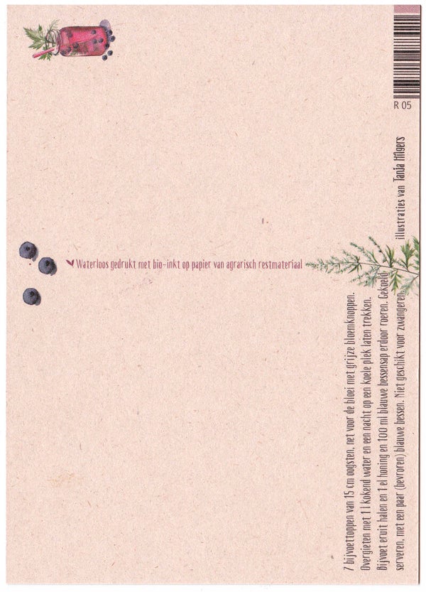 Op de voorkant staat een leuke illustratie van de wilde kruiden en ingrediënten voor het recept. Op de achterkant staat het recept.