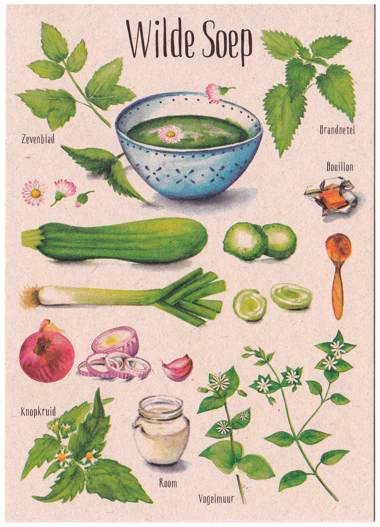 Op de voorkant staat een leuke illustratie van de wilde kruiden en ingrediënten. Op de achterkant staat het recept.