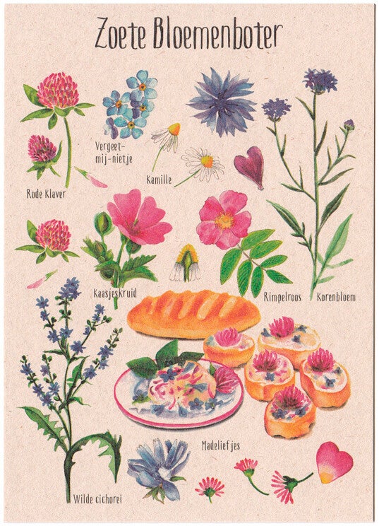 Postkaart met recept voor Eetbare Bloemen