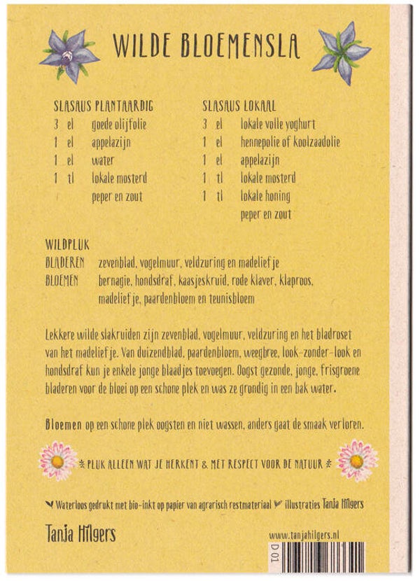 Op de voorkant staat een leuke illustratie van de wilde planten en ingrediënten voor het recept. Op de achterkant staat het hele recept.