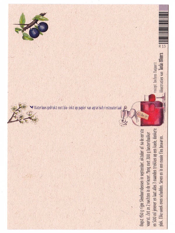 Op de voorkant staat een leuke illustratie van de wilde kruiden en ingrediënten voor het recept. Op de achterkant staat het recept.
