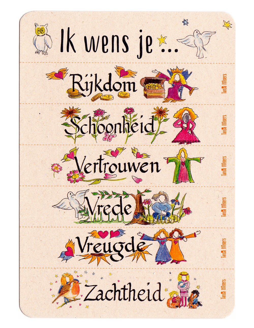 Met deze kaart stuur je Rijkdom, Schoonheid, Vertrouwen, Vrede, Vreugde en Zachtheid.